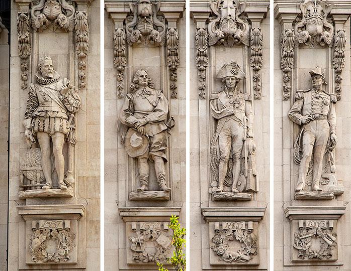 - The fourth statue is understood to be a ‟representativeˮ figure, rather than a specific person, from the period when the building was constructed. It shows an early 20th century admiral, with sextant and binoculars