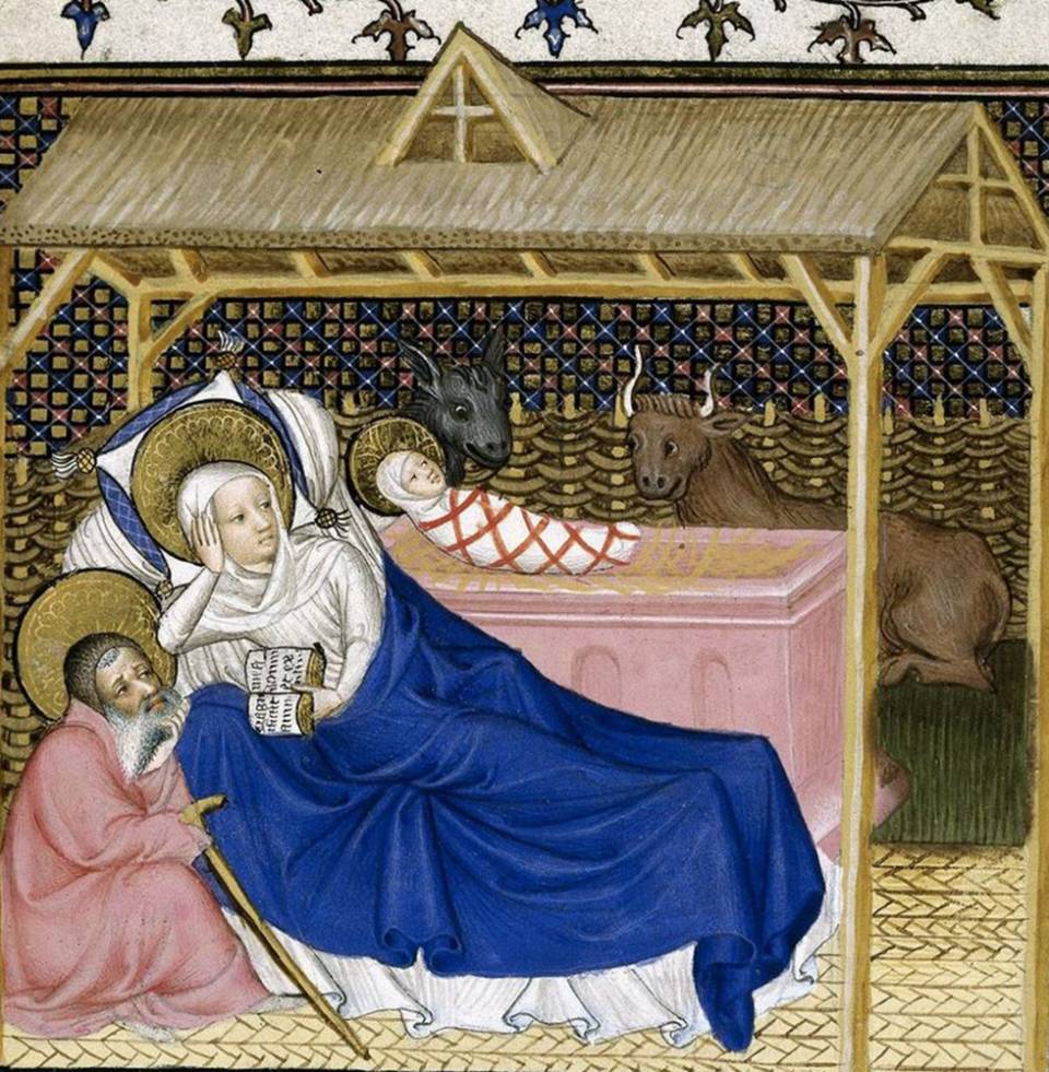 Image: lluminated Manuscript The Nativity 1400s HM 1163 Book of Hours of Paris manuscript at Huntington Library at Berkeley online at Digital Scriptorium.