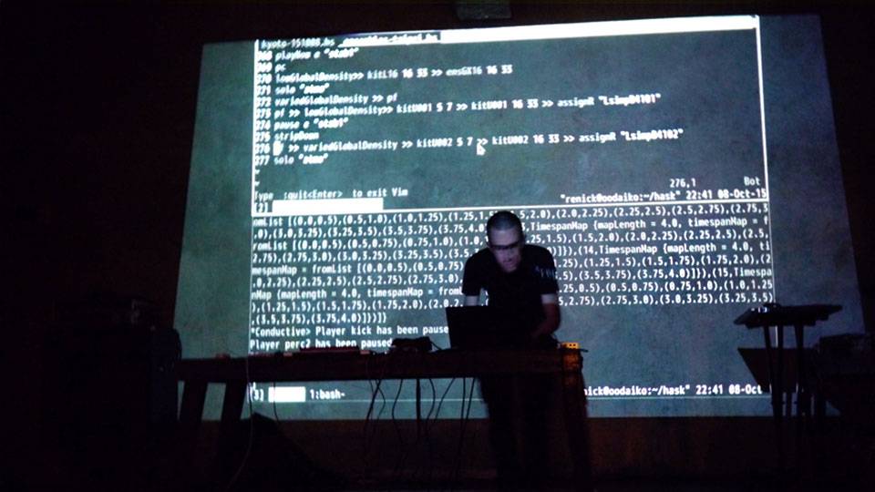 Renick is a live-coder (or “algoraver“), creating complex, shifting rhythmic soundscapes through programming on-the-fly in Haskell, combining the flow of improvised music with body-pounding techno.