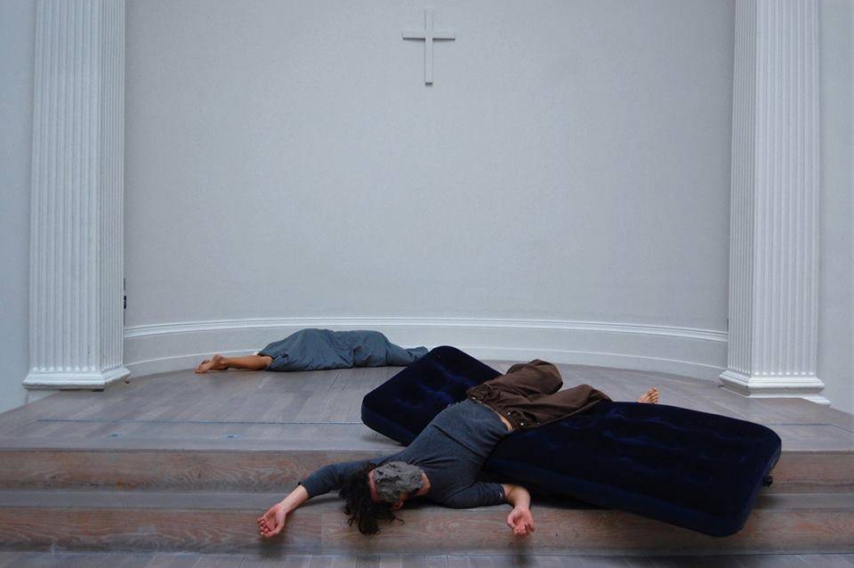 “Allusion to a Body No Longer Present” is made of four main elements: a stage-like installation, a performance, a conversation room, and two audience-engaging events. The work, created specifically for the Swiss Church, deals with questions of impermanence, legacy and significance, heightened by the location within a church that resembles a white cube. It is composed of a collection of props displayed as an installation within the church. Breathing air mattresses, mounds of wet clay, stacks of drinking glasses, a large mirror, and clothing form the primary elements of the installation; the simple materials alluding to and providing support for performances of creation, sentience, and destruction. These items together act as a trace-like memory of the performance – and will remain present between and after performances.