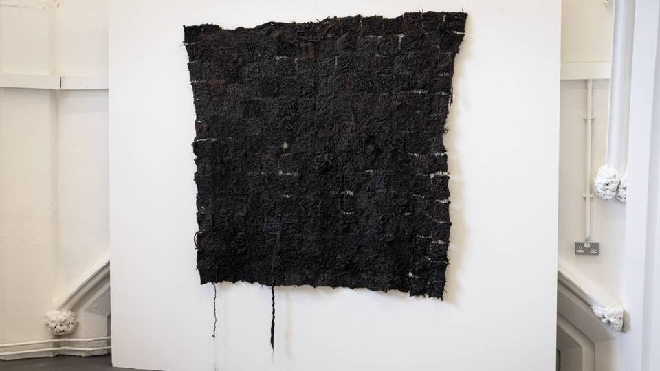 The exhibition, 'Knotted', features her degree show work, which the judging panel praised for its combination of aesthetics and politics in a carefully considered and expertly executed combination of textile and sound work. ‘I Exist as Cocoa Butter and Mangos’ consists of a blanket constructed from hand woven squares of black hair made by the artist on a small portable loom. In the words of guest judge Dr. Christine Checinska (Artist, writer, Designer):