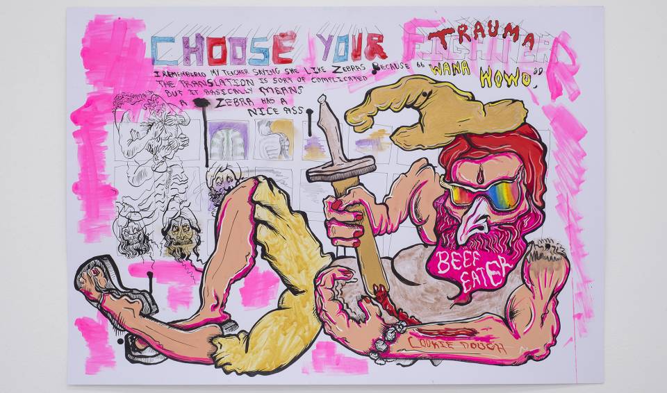 Hardeep Pandhal typically works with drawing and voice. His work primarily reflects and expands upon experiences with racism, through flights of fantasy and associative thinking