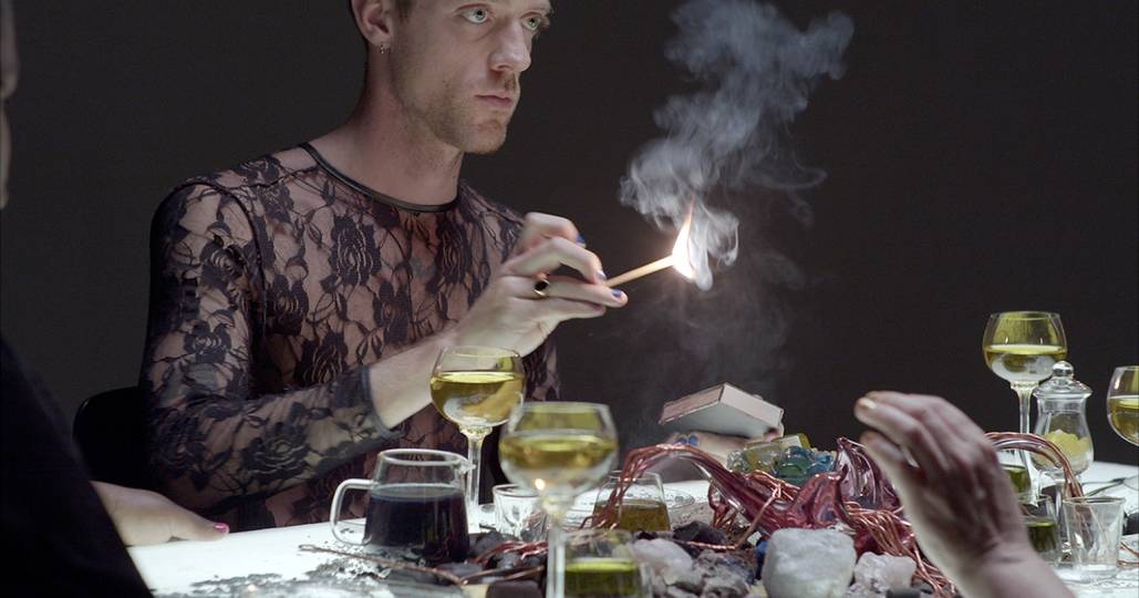 'The Feast' documents a metabolic feast, a dinner ritual commemorating the end of humanityʼs reliance on fossil fuels, happening sometime in the future when humans harvest and distribute surplus energy generated by their metabolisms and movements. The dinner guests consume fossil fuels and other minerals once used in energy production, such as coal, crude oil, diesel, lithium and uranium, whilst discussing the strategies employed in the past such as mourning, fighting, redistribution and decolonisation in the struggle to wean society from dirty energy and avert climate catastrophe.