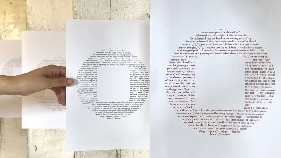 Intellectual Property is a series of long-form poems that propose the law of intellectual property as poetry’s dark twin — both forms task language with the burden of shaping the intangible, and both forms consider human ingenuity to be of infinite value. Weaving through a series of landmark court cases, the poems apply the laws of intellectual property to our private lives and seek to determine what constitutes an idea, and whether we can ever own one. Language’s brutal extreme is usually reserved for the law — this pamphlet explores what happens when it infiltrates poetry.