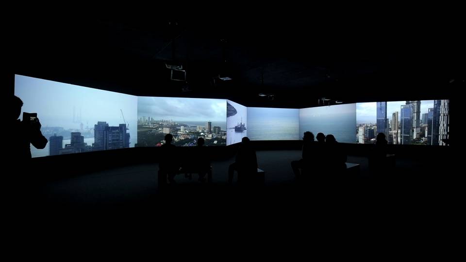 Image caption: Bombay Tilts Down, 6 channel CCTV projection, 2023.