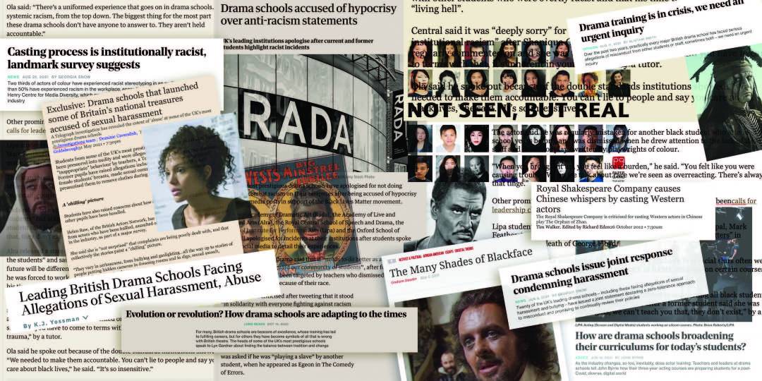 In June 2020, the public response to George Floyd’s murder and the Black Lives Matter movement generated a large number of complaints from students from across the four nations. These students mobilised various campaigns directed towards the senior leadership of their training institutions. The students were asking for institutional issues concerning racism and other inappropriate behaviours to be acknowledged and addressed. Many students and alums were forthright in highlighting the discriminatory practices in actor training, the pedagogy and the curriculum they had not only witnessed but experienced in their training.
