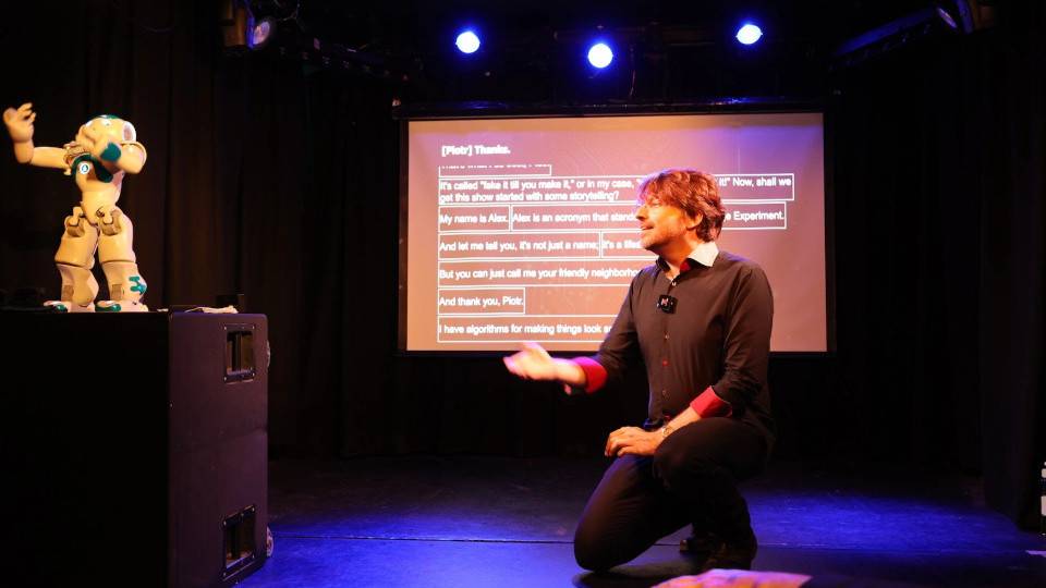 The term “robot” first appeared in Karel Čapek’s 1920 play R.U.R., but it took 80 years of technological progress in artificial intelligence (AI) to bring robots into live performances alongside actors. The coexistence of naturalism and artifice, of script and improvisation, allowed theatre companies to explore human-AI relationships, while the impressive developments in language and image models have both opened new creative possibilities for artists and surfaced ethical concerns about the impact of generative AI upon the arts.