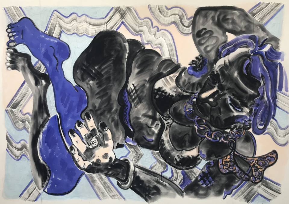 The exhibition captures the particular blend of irony and sincerity that characterised Thompson’s most recent work, which explored romantic novels and sun-drenched summer holidays as spaces for escapism and sensual self-reinvention. Her paintings are informed by sources as diverse as Francis Picabia, Shirley Valentine, Japanese woodcuts, and emojis, establishing a languid and luxurious visual language with which to capture cellulite, sunbathing, and lobster with sorbet. Works such as Hunter Watching the Beach (2016) and La Vergne in the Afternoon (2017) encapsulate her irreverent reclamation of the exoticised and eroticised female nude, exploring the art historical trope for its contemporary resonance, inserting middle aged bodies into the frame in heat-drenched colours. Later paintings, such as Temple Creation (2020) and Scuba Sauvage Azure Bleu (2021) assert new and confident visual languages and painterly techniques, incorporating ink washes, experimental canvases, lyrical lines, and codes of emojis to express the frustrations and triumphs of the female body finding agency amongst the restrictive distortions of mediated beauty.