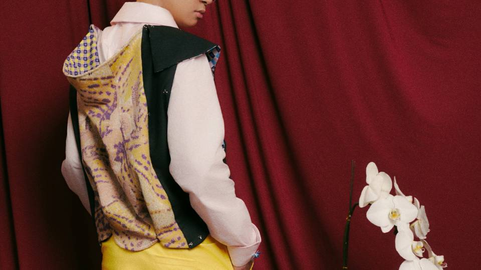 Drawing from androgynous tailoring, deconstruction, and multicultural identity, the design subverts menswear’s conventional boundaries by integrating historically coded feminine elements. A reinterpreted baby carrier becomes a back panel and collar, linked with apron forms and engageante-style sleeves and connected by brassiere hooks for easy assembly and disassembly. Trousers feature extended zippers to transform into a skirt, altering form and function.
