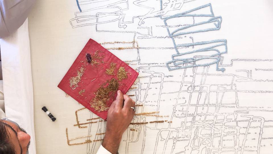 The project continued in 2017 and 2019 with embroiderers in Islamabad. Each piece evolved through shared experimentation across wool, muslin, and cotton, stitched with metallic thread, cotton floss, and handmade yarns. Over nearly a decade, the work travelled between Toronto and Pakistan, shaped by many hands in an ongoing conversation of drawing and thread.