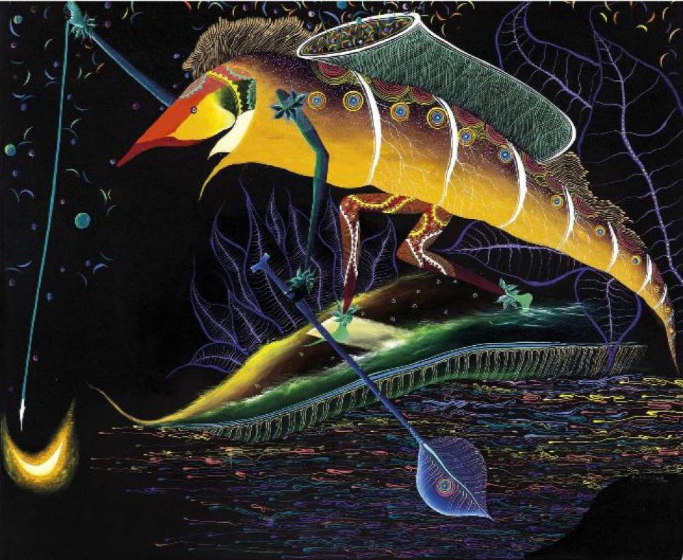 Image Credit: "Pescador de lunas," acrylic on canvas, Rember Yahuarcani, 2024.