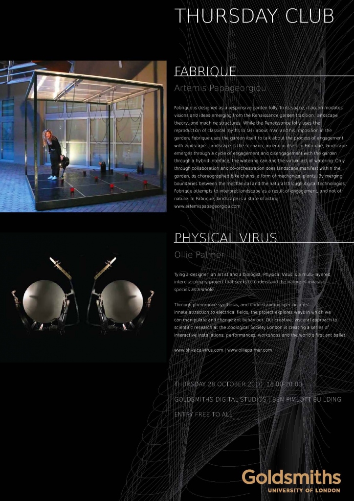 Palmer's Physical Virus is an interdisciplinary project that seeks to understand the nature of invasive species as a whole. Papageorgiou's Fabrique is designed as a responsive garden folly.