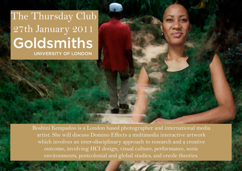 Roshini will discuss Domino Effects a multimedia interactive artwork available as a touring art installation from 2010 and beyond. It involves an inter-disciplinary approach to research and a creative outcome, involving HCI design, visual culture, performance, sonic environments, postcolonial and global studies, and creole theories.