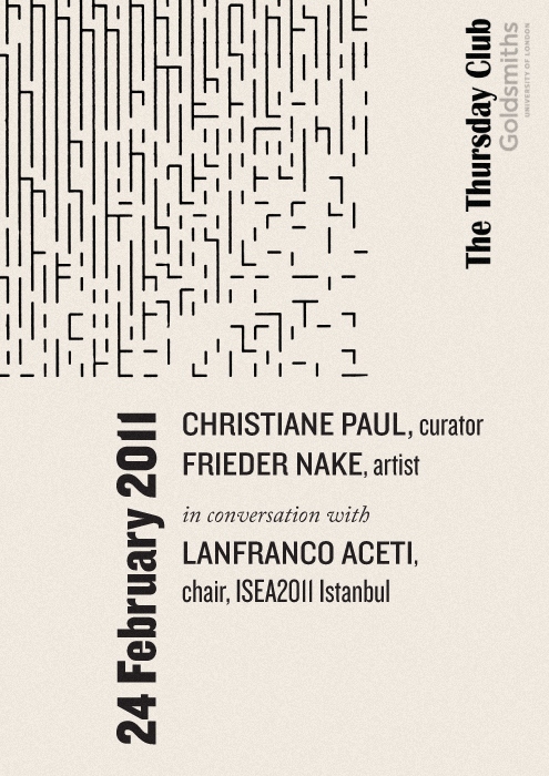 Frieder Nake belongs to the founding fathers of (digital) computer art. He produced his first works in 1963. Frieder Nake is Professor for Compter Graphics and Interactive Systems at the University of Bremen, Germany, and has had a long involvement with digital art. He and fellow pioneers Primarily a mathematician, Nake's colored computer drawings in 1967, for example, explored the visual expression of series of matrix multiplications, imagery that has an undeniable artistic intention. He has contributed to all major exhibitions of computer art, including Cybernetic Serendipity in London (1968), tendencies 4 in Zagreb (1968), and the long lasting Goethe Institute show during the 1970s.