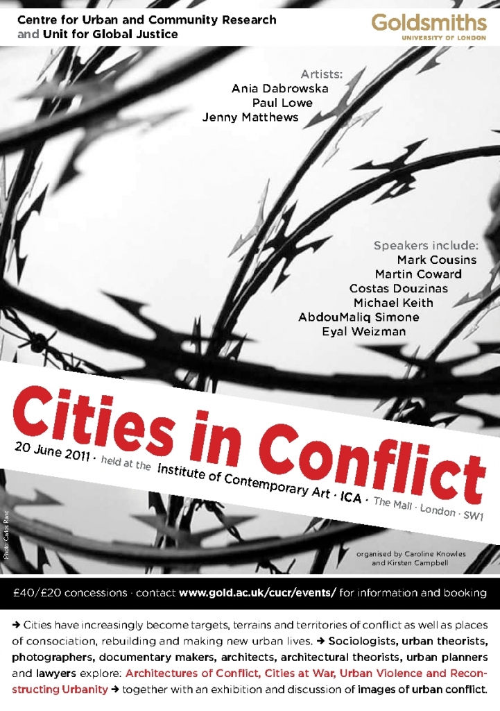 This conference explores these questions by bringing together sociologists, urban theorists, photographers, documentary makers, architects, architectural theorists, urban planners, and lawyers to explore four panel themes: Architectures of Conflict, Cities at War, Urban Violences, and Reconstructing Urbanity, together with an exhibition and roundtable discussion of images of cities in conflict.