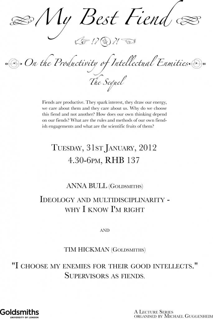 Anna Bull (Goldsmiths) "Ideology and multidisciplinarity - why I know I'm right" and Tim Hickman (Goldsmiths) "I choose my enemies for their good intellects." Supervisors as fiends.