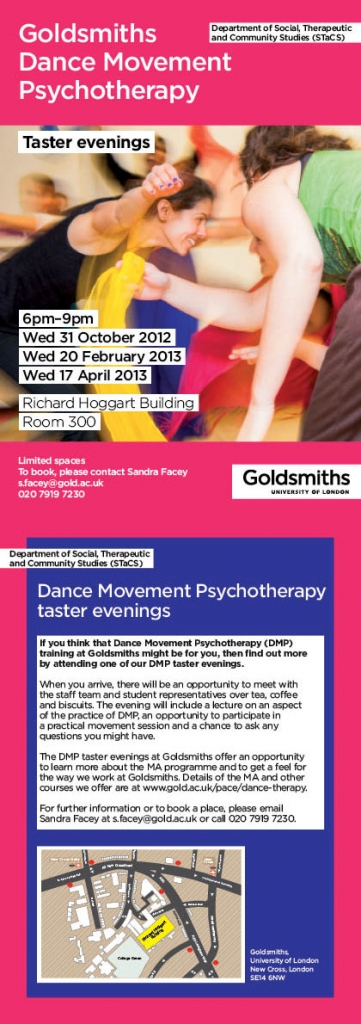 We will begin at 6pm and finish by 9pm. When you arrive, there will be an opportunity to meet with the staff team and student representatives over a cup of tea/coffee and biscuits. The evening will include a lecture on an aspect of the practice of Dance Movement Psychotherapy, an opportunity to participate in a practical movement session and a chance to ask any questions you might have.
