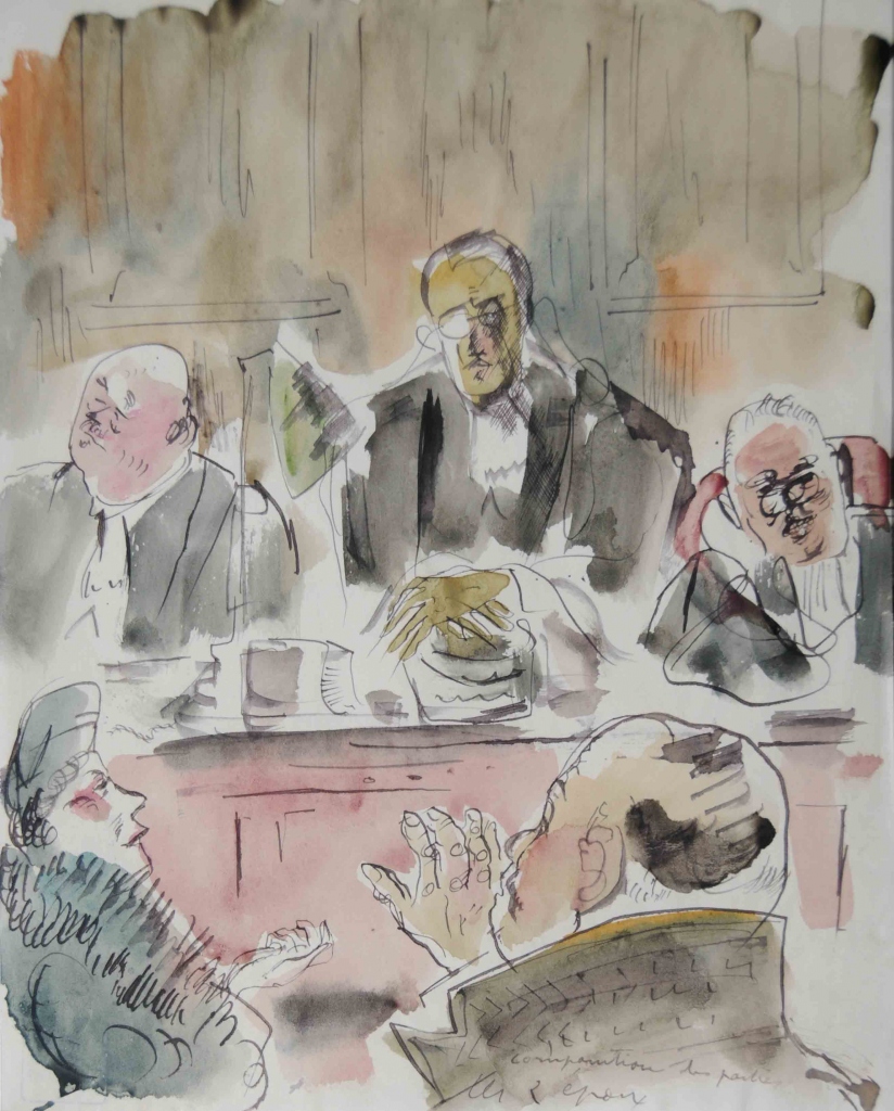 Throughout his career from 1930 to 1970 the French Judge Cavellat sketched the courtroom scenes unfolding before him. I, a judge myself, explore these images which I believe not only show the judge’s thoughts strongly shaped by his education and training. The intimate impressions also reveal the troubled relationship between the judge’s legal education and habitus and the personal feelings and fantasies while going about his profession. The latter I argue lay bare his personality, background, class and gender.