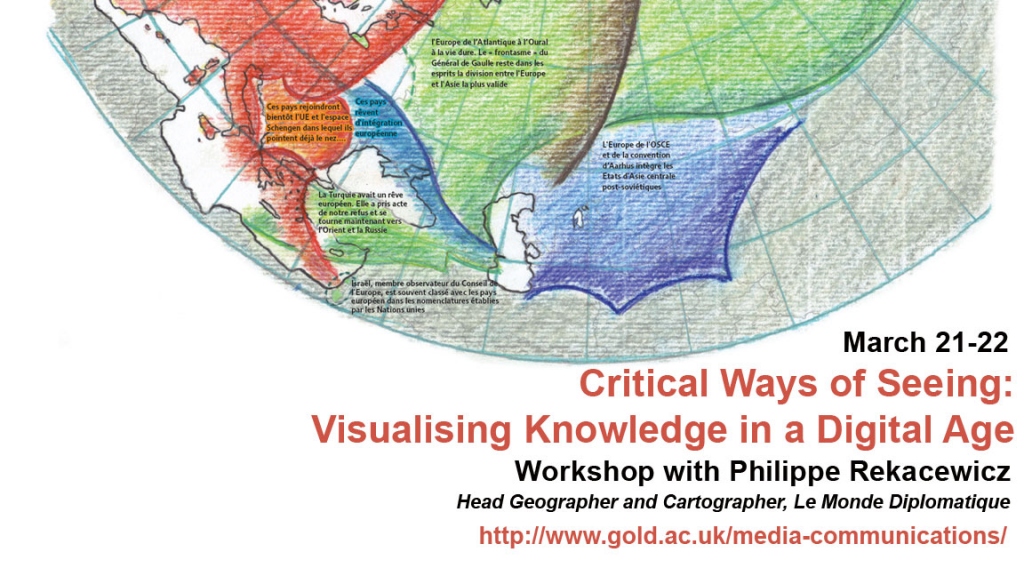This two-day workshop brings a world-renowned exponent of conventional and radical cartography, Philippe Rekacewicz, to the department to guide and inspire students, either as part of their research inquiry or as a way to think through and present their research. The public forum that closes the workshop brings other experts together with Dr Rekacewicz to present and debate these issues based on their respective projects. The Workshop will begin with a presentation by Dr Reckacewicz that is open to all registered participants. In the Masterclass sessions that follow, selected students will bring their particular issues and interests to the table, and get help and guidance about the techniques of traditional and radical cartography, as a basis for experimenting with these new techniques in a critical and reflexive way.