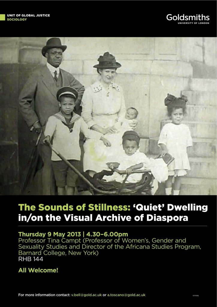 This paper engages three innovative conceptual frameworks for theorizing diasporic formation that depart from traditional emphasis on mobility, resistance and expressiveness as primary idioms of black culture. It elaborates the concepts of quiet, stasis, and fugitivity, and uses them to consider what they tell us about what we overlook, overhear, erase or leave unremarked in diasporic formations. Vernacular photography offers an important and frequently overlooked window into practices of diasporic dwelling and fugitivity, when we attend differently to the quiet practices of stasis through which they image fugitivity. Reading these three keywords together through the photography of a Black German family offers a provisional glimpse into the possibilities of theorizing some of the fugitive practices often rendered unvisible in other diasporic frames.