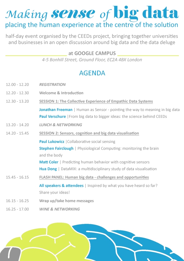 This interdisciplinary event, organised the the Collective Experience of Emphatic Data Systems project (CEEDs) brings together academics and businesses in an open discussion around the data deluge covering a wide range of topics: from cognition, to sensors; from human behaviour to data visualisation.