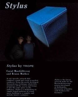 Stylus is a site-specific artwork that combines sound and vision in perfect synthesis. Using the newly developed diasynchronic technique - which lifts animation off the screen and brings it into the same space as the audience - Stylus is a meditation on simple looped patterns of visual music that builds to a complex and melodic kinetic sculpture.