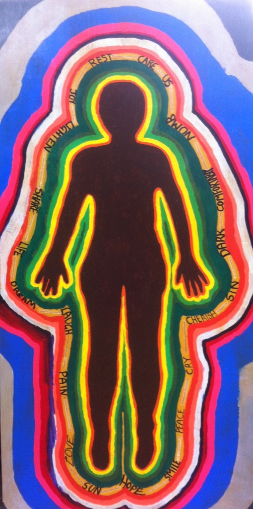 Some groups decided on creating a defined image. Other groups began painting and let the process unfold. We explored patterning, layering of textures, celebration of colours and images, metaphors, figures, landscapes and text.