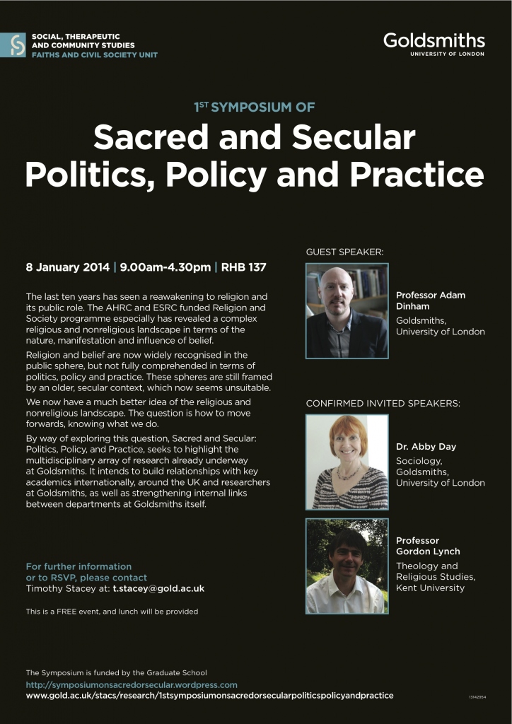 By exploring this question, Sacred and Secular: Politics, Policy and Practice, seeks to highlight the multidisciplinary array of research already underway at Goldsmiths. It intends to build relationships with key academics internationally, around the UK and researchers at Goldsmiths, as well as strengthening internal links between departments at Goldsmiths itself.