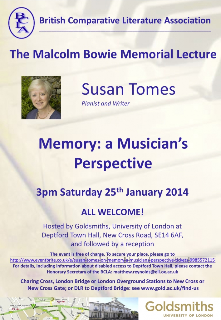 Susan Tomes, Pianist and Writer, gives the BCLA's 2014 Malcolm Bowie Memorial Lecture.