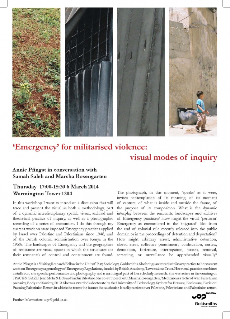 Annie Pfingst is a Visiting Research Fellow in the Unit of Play, Sociology, Goldsmiths. She brings an interdisciplinary practice to her current work on Emergency: a genealogy of Emergency Regulations, funded by British Academy/Leverhulme Trust. Her visual practice combines installation, site specific performance and photography and is an integral part of her scholarly research. She was active in the curating of SPACE & GAZE: Jean Mohr & Edward Said in Palestine. She co-authored, with Marsha Rosengarten, ‘Medicine as a tactic of war: Palestinian precarity, Body and Society, 2012. She was awarded a doctorate by the University of Technology, Sydney for Erasure, Enclosure, Excision: Framing Palestinian Return in which she traces the frames that authorise Israeli practices over Palestine, Palestinians and Palestinian return.