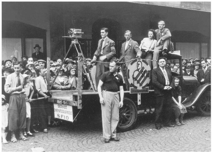 The photograph shows a young Eric Hobsbawm observing a victory parade of the French Popular Front in Paris in 1936. Hobsbawm is on the last on the right, perched on the flat-bed lorry.