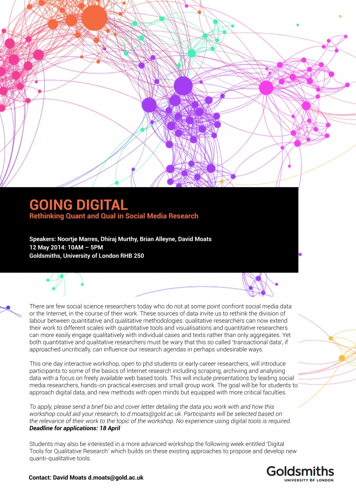 This one day interactive workshop, open to up to 15 phd students or early career researchers, will introduce participants to some of the basics of Internet research including scraping, archiving and analysing data with a focus on freely available web based tools. The program will begin with a brief welcome by Noortje Marres, convener of the Digital Sociology MA program, followed by presentations by Brian Alleyne and Dhiraj Murthy on their recent work. David Moats will then explain the capabilities and limitations of various existing tools (including the Google Scraper, Issue Crawler, Twitter Archiver and Facebook application Netvizz) with hands on exercises. Finally we will split into small groups to experiment with some of these approaches. The goal will be for students to approach digital data, and new methods with open minds but equipped with more critical faculties.