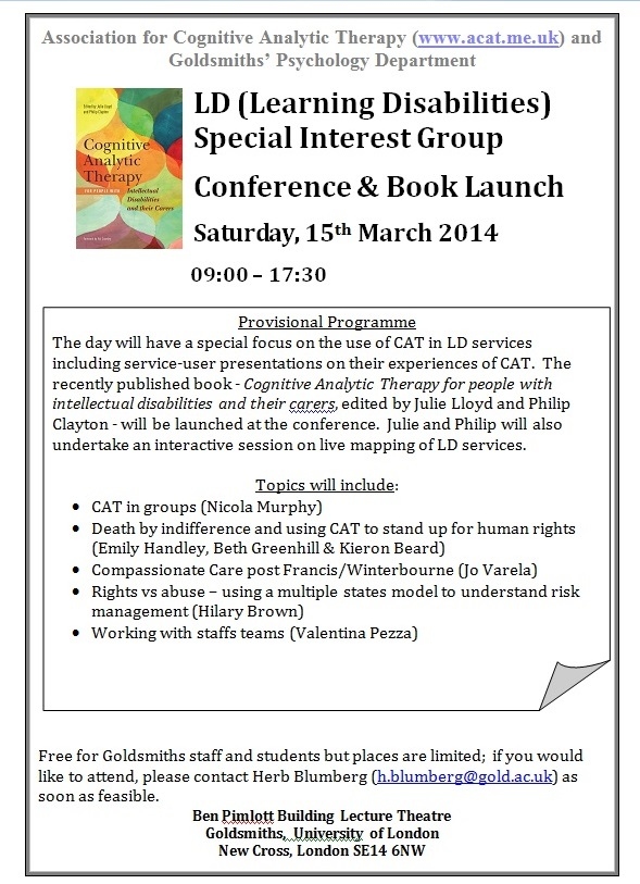 The day will have a special focus on the use of CAT in LD services including service-user presentations on their experiences of CAT. The recently published book - Cognitive Analytic Therapy for people with intellectual disabilities and their carers, edited by Julie Lloyd and Philip Clayton - will be launched at the conference. Julie and Philip will also undertake an interactive session on live mapping of LD services.