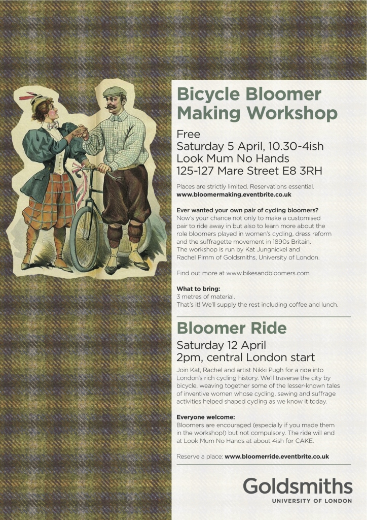 Now's you chance to not only make a customised pair to ride away in, but also to learn more about the role bloomers played in women's cycling, dress reform and the suffragette movement in 1890's Britain.