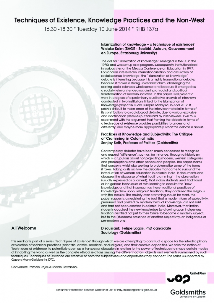 The call for “Islamization of knowledge” emerged in the US in the 1970s and was set up as a program, subsequently institutionalized in various sites, at the Mecca Conference on Education in 1977. For scholars interested in internationalization and circulation of social science knowledge, the “Islamization of knowledge”-debate is interesting because it is a highly transnational debate; because it makes a strong universalist claim, challenging the existing social sciences wholesome; and because it emerged as a socially relevant endeavor, aiming at social and political transformation of modern societies. In this paper I will present a work-in-progress of a preliminary qualitative analysis of interviews conducted in two institutions linked to the Islamization of Knowledge-project in Kuala Lumpur, Malaysia, in April 2012. It proves difficult to make sense of the interview material in terms of its contribution to a sociological debate, due to various exclusive and doctrinarian premises put forward by interviewees. I will thus experiment with the argument that framing the debate in terms of a technique of existence provides possibilities to understand differently, and maybe more appropriately, what this debate is about.