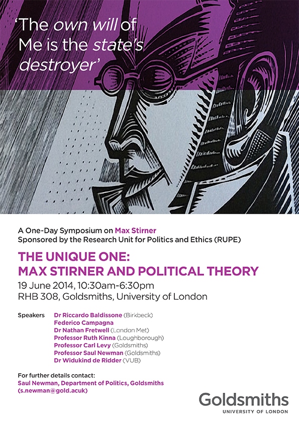 Max Stirner was one of the most radical and controversial thinkers of the post-Hegelian tradition. His philosophy of egoism had an enormous influence on existentialism, individualist anarchism, strands of feminism, and the artistic avant-garde in the nineteenth and twentieth centuries. Yet today his thought is often misunderstood or ignored altogether. This event will revisit Stirner's work and explore his unique contribution to political theory and philosophy. This is a one-day symposium organised by the Research Unit for Politics and Ethics (RUPE).