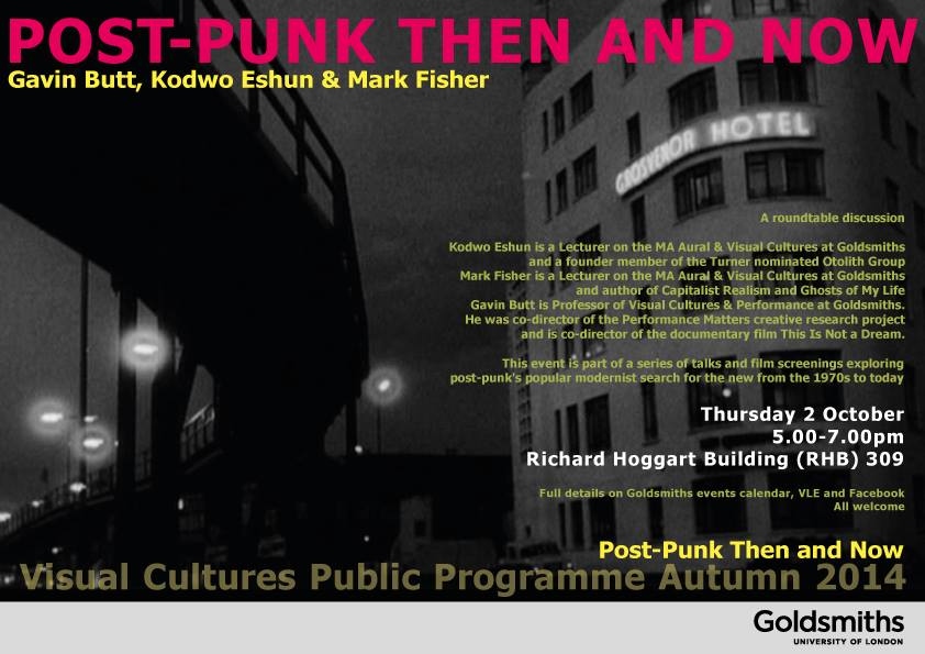 Gavin Butt, Kodwo Eshun & Mark Fisher introduce the Visual Cultures Public Programme Autumn 2014: 'Post-Punk Then and Now'.