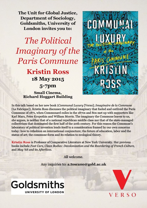 In this talk based on her new book ('Communal Luxury' [Verso]; 'L'Imaginaire de la Commune' [La Fabrique]), Kristin Ross discusses the political imaginary that fueled and outlived the Paris Commune of 1871, when Communard exiles in the 1870s and 80s met up with supporters like Karl Marx, Peter Kropotkin and William Morris. The imaginary the Commune leaves to us, she argues, is neither that of a national republican middle class nor that of the state-managed collectivism that dominated the first half of the 20th century. For this reason the Commune's laboratory of political invention lends itself to a consideration framed by our own concerns today: how to refashion an international conjuncture; the future of education, labor and the status of art; the commune-form and its relation to ecological theory.