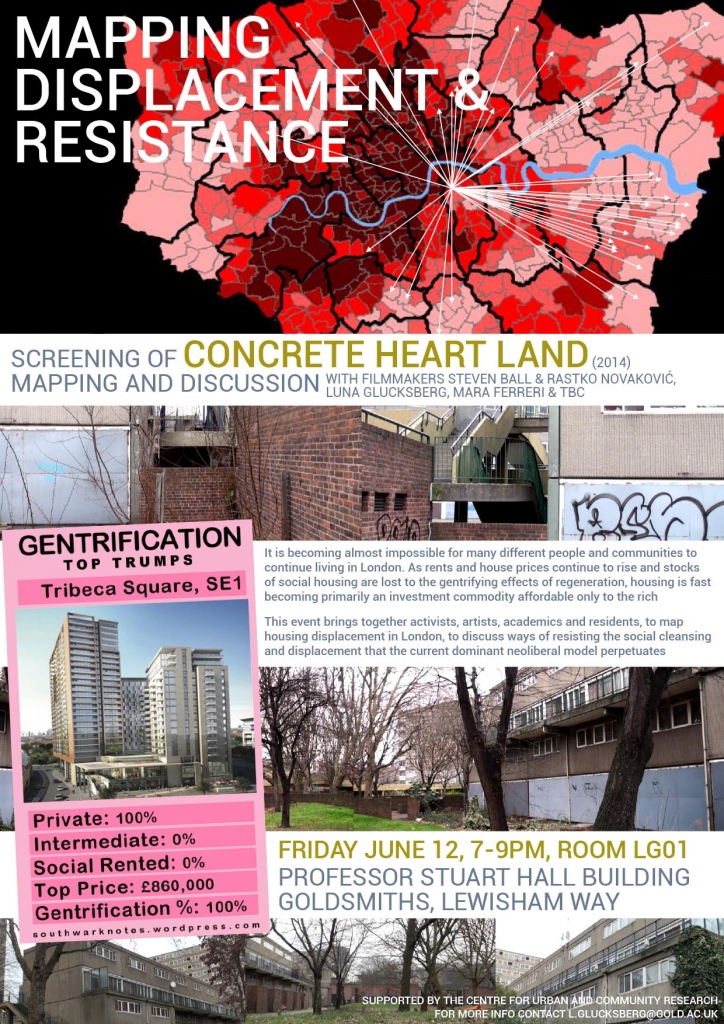 This event brings together activists, artists, academics and residents, to map housing displacement in London, to discuss ways of resisting the social cleansing and displacement that the current dominant neoliberal model perpetuates.