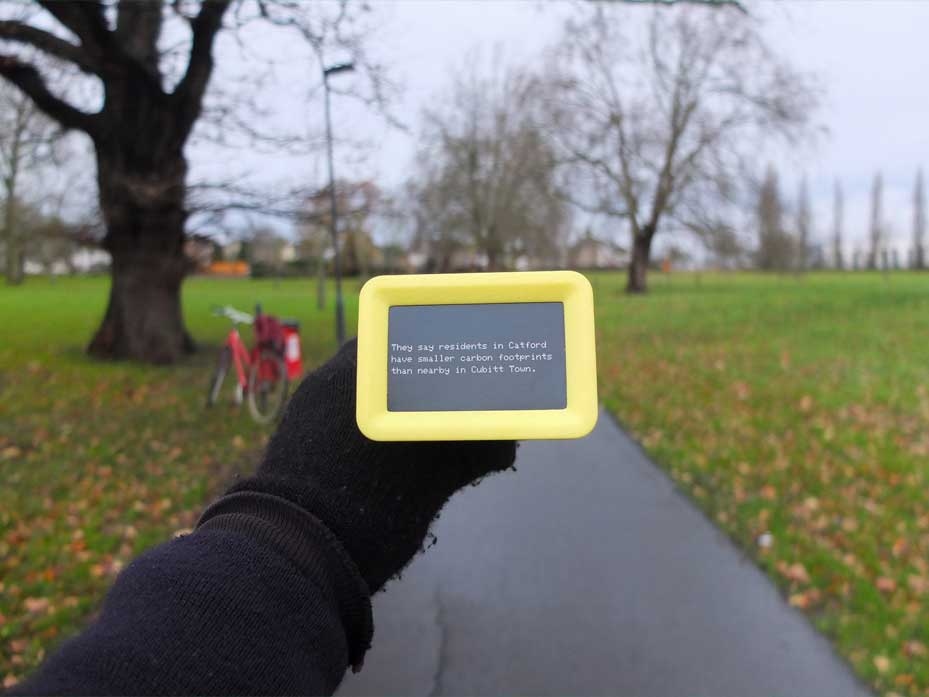 Participants will be given a unique device developed by the Goldsmiths Interaction Research Studio (Design) to try out on the streets and public spaces of New Cross. Not only will participants get to use a device developed by the Studio, they will help define what it is and how it can be used. The 40-minute tour will begin at Goldsmiths’ St James Hatcham Building before heading back for a round-table discussion. During these sessions Studio members will discuss the process and motivations behind the device, its development and the challenges and difficulties faced in making it. Participants are thought of as genuine collaborators, giving the Studio a valuable insight into their methods and approaches.