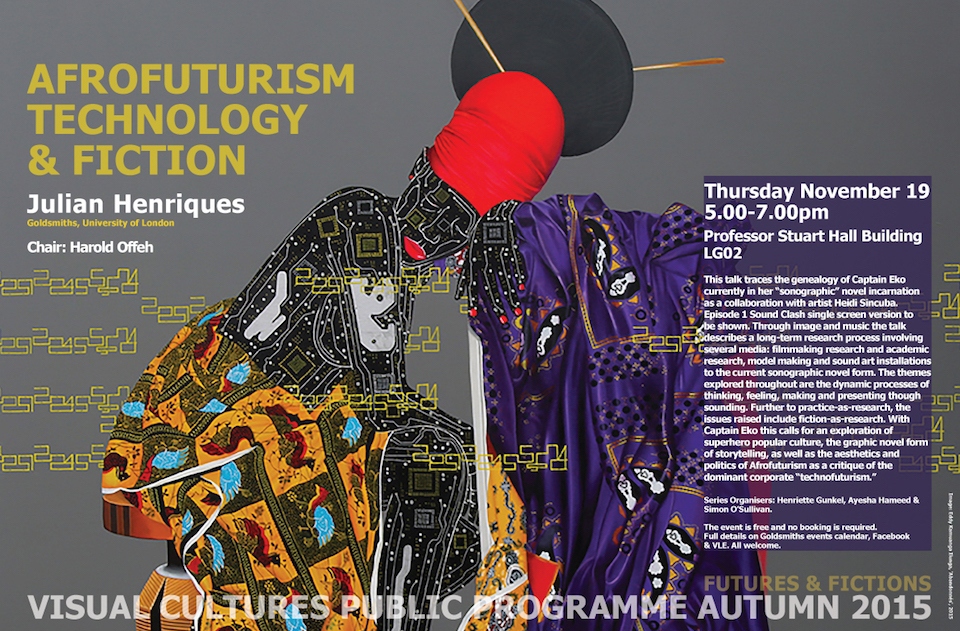 This talk traces the genealogy of Captain Eko currently in her “sonographic” novel incarnation as a collaboration with artist Heidi Sincuba. Episode 1 Sound Clash single screen version to be shown. Through image and music the talk describes a long-term research process involving several media: filmmaking research and academic research, model making and sound art installations to the current sonographic novel form. The themes explored throughout are the dynamic processes of thinking, feeling, making and presenting though sounding. Further to practice-as-research, the issues raised include fiction-as-research. With Captain Eko this calls for an exploration of superhero popular culture, the graphic novel form of storytelling, as well as the aesthetics and politics of Afrofuturism as a critique of the dominant corporate “technofuturism.”