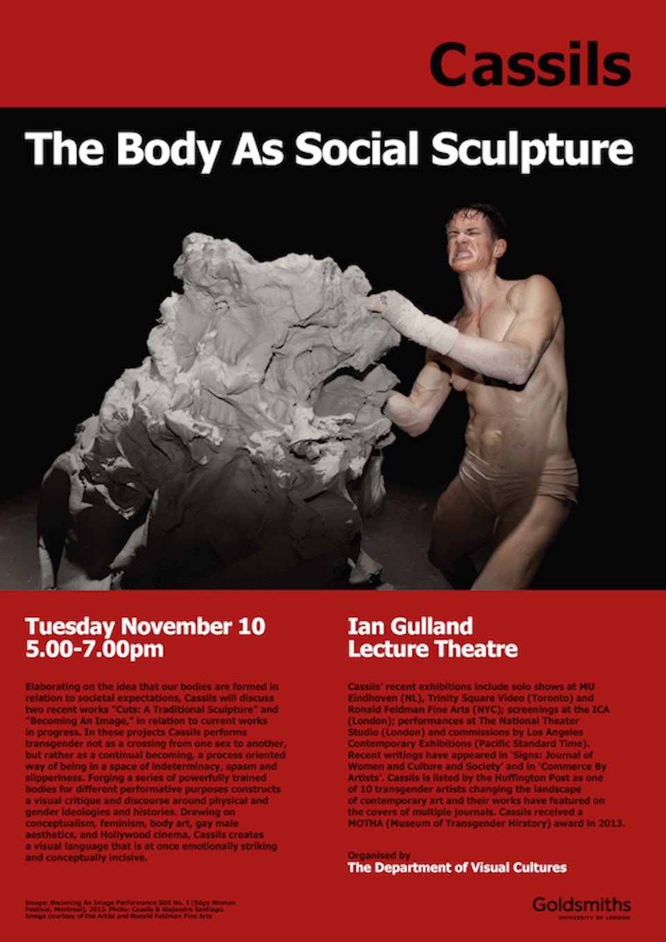 Elaborating on the idea that our bodies are formed in relation to societal expectations, Cassils will discuss two recent works "Cuts: A Traditional Sculpture" and "Becoming An Image," in relation to current works in progress. In these projects Cassils performs transgender not as a crossing from one sex to another, but rather as a continual becoming, a process oriented way of being in a space of indeterminacy, spasm and slipperiness. Forging a series of powerfully trained bodies for different performative purposes constructs a visual critique and discourse around physical and gender ideologies and histories. Drawing on conceptualism, feminism, body art, gay male aesthetics, and Hollywood cinema, Cassils creates a visual language that is at once emotionally striking and conceptually incisive.