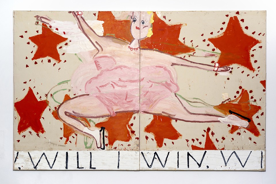 Rose Wylie was born in 1934 and lives and works in her Kent cottage, producing extremely large paintings on unstretched, unprimed canvas, stapled floor to ceiling. The paintings are inspired by films, art history, politics, cartoons – everything around her: though there are echoes of South Park, Guston, Werner Herzog, Polke and Pompeii, comparisons are hard to sustain.