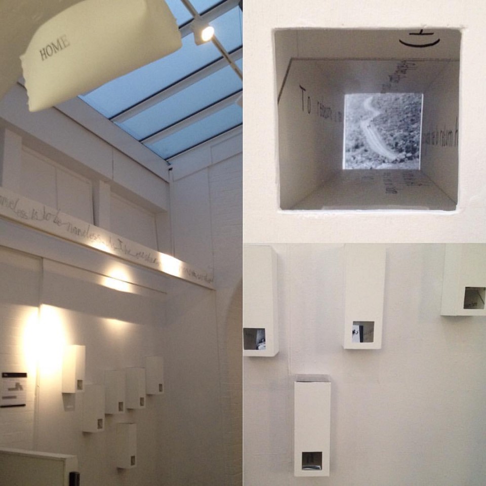 Words and images from A Seventh Man, which was translated into different languages, have been re-enacted in the Kingsway Corridor by the artist Antoinette Brown, in collaboration with Nirmal Puwar. Chalk, blackboards and wire jolt the words out of the book and onto the walls of the academy. Contemporary graffiti from Larache’s harbour sits amongst selections from the book. In addition, Sadek Rahim’s sponge boats from his project No Crash! Boom! Bang!, originally installed in the Bibliothèque Nationale d'Alger, hang in the arches of the passageway.