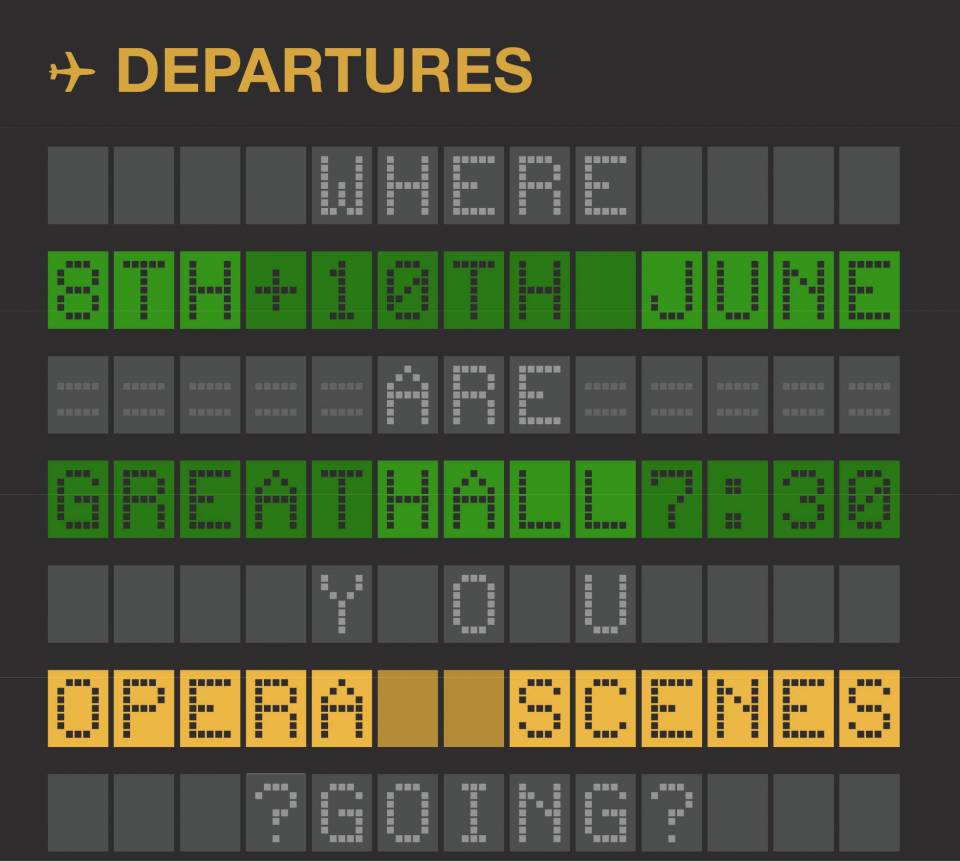 7:30pm - 9:30pm Another chance to see OperaScenes, conducted by Holly Mathieson and directed by John Wilkie |