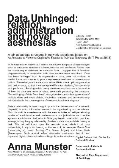 In An Aesthesia of Networks, I rethink the function and place of assemblages such as databases in network cultures, histories and aesthetics. Rather than the conceiving of database as symbolic form, I suggest that it functions diagrammatically in conjunction with other sociotechnical machines. Data has been ‘unhinged’ from its organisational base, does not conform to medial forms and ceases to play a representational role in contemporary culture. The redesign of the database in the 1960s shook up its organisation and performance, so that it worked quite differently, ‘declaring’ its operativity as it performed. Running a data query simultaneously became a declaration of how the data sets were to relate, essentially generating the database. This unhinging of data from ‘base’, alongside the concomitant generation of multiple views and levels of data, made data relational, and this relationality is imbricated in the co-emergence of a new sociotechnical diagram. Data’s relationality is been caught up with the development of a network dispositif, in which information comes to be organized by and as relation. This dispositif is co-extensive with the new activities of self-perpetuating modes of administration and machine-human subjectivations such as the systems administrator. And yet out of this gray terrain novel artistic practices emerge, taking the gray relationality of network, database and data mining to task. This talk will touch upon this aesthetic work, which I call data undermining in my book, looking at the work of, for example, Paolo Cirio (persecuting.us), Heath Bunting (The Status Project) and Adam Nash (Autoscopia). Such artwork offers alternative aesthesias that do not represent digital culture but rather unhinge its territorialisations.