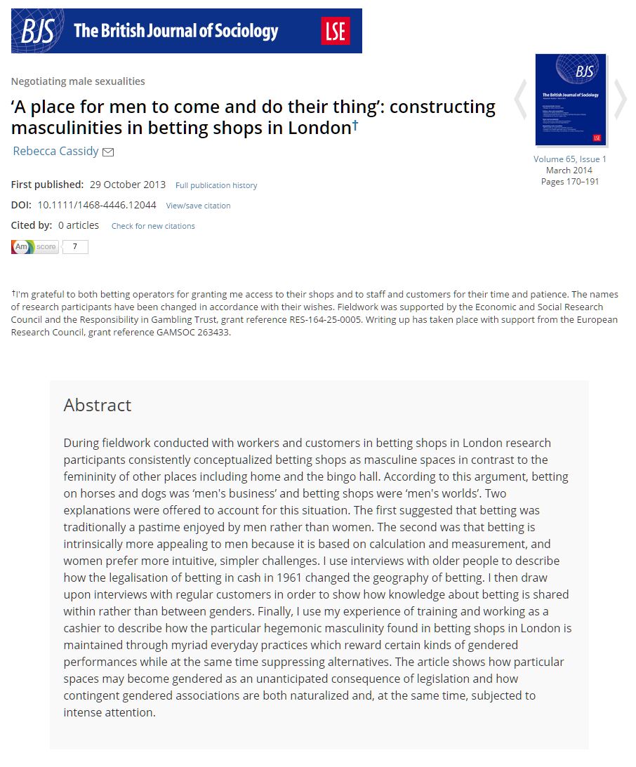 Cassidy, R. (2014). 'A place for men to come and do their thing': constructing masculinities in betting shops in London. British Journal of Sociology, 65(1):170-91. |