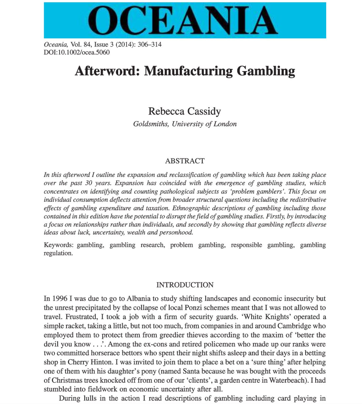 Cassidy, R. (2014). Afterword: Manufacturing Gambling. Oceania 84 (3): 306-314 |
