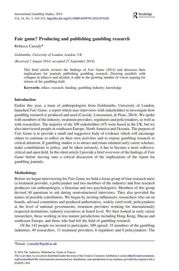 Cassidy, R. (2014) Fair game? Producing and publishing gambling research. International Gambling Studies 14 (3): 345-353] |