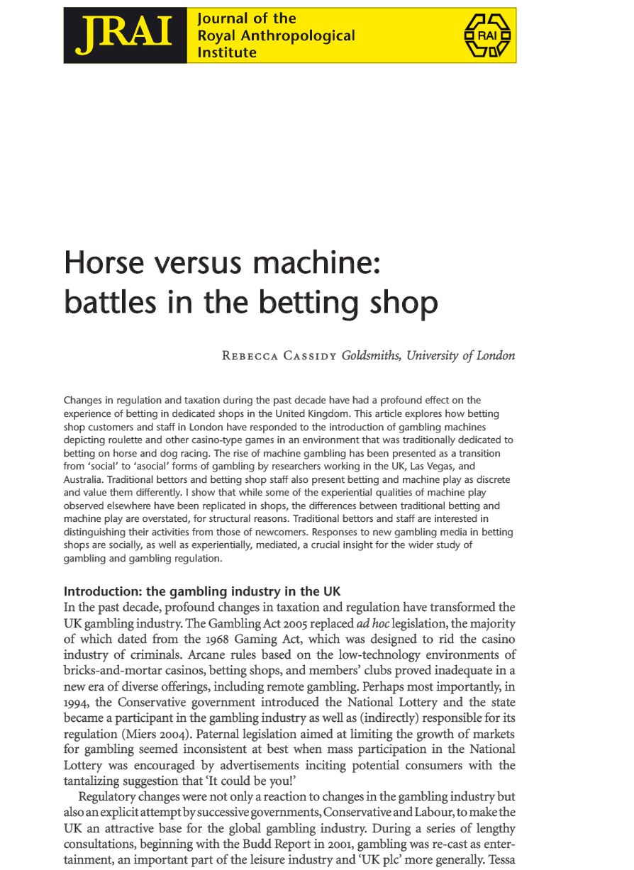 Cassidy, R. (2012). 'Horse versus Machine: battles in the betting shop'. Journal of the Royal Anthropology Institute 18(2): 266-284. |
